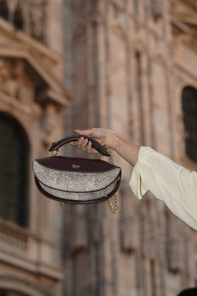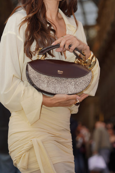 Produzida em couro liso com detalhe em couro com pelo, revela texturas que conversam entre si um diálogo de contrastes naturais.