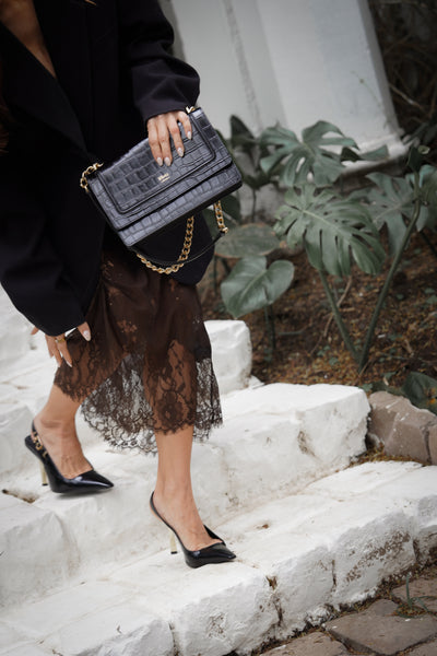 A bolsa Madalena em croco preto é a definição de elegância atemporal. Seu acabamento em couro texturizado traz sofisticação, enquanto a alça de corrente regulável permite versatilidade no uso, do ombro à transversal. Minimalista e marcante, Madalena combina praticidade e estilo, tornando-se a escolha perfeita para compor looks poderosos e modernos em qualquer ocasião.